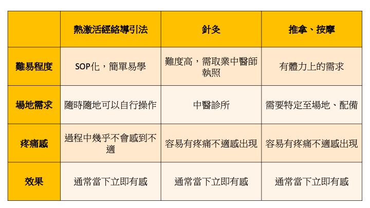 我們將熱激活經絡導引法與常見的針灸、推拿、按摩等保健法相比,並把所有的差異整理成下表以利觀看: