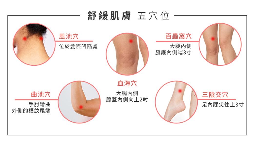 5-10分鐘按壓以下5個穴位,也有助於舒緩肌膚乾癢的困擾: