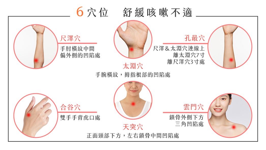 • 太淵穴:手腕橫紋,拇指根部的凹陷處